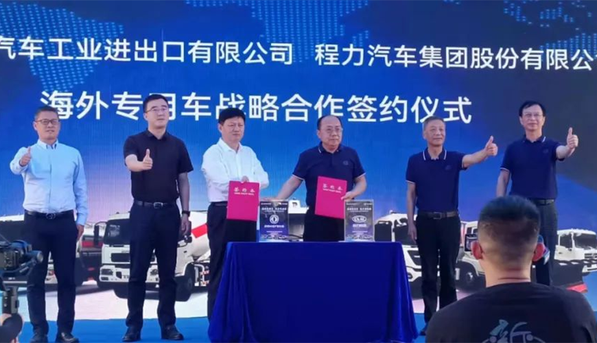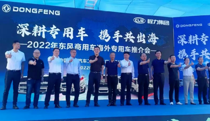 在这次线下大型东风商用车海外市场新产品推荐会上,中国东风汽车工业进出口有限公司与程力汽车集团股份有限公司联合举行了海外专用车战略合作签约仪式,双方高层领导签约后合影纪念。