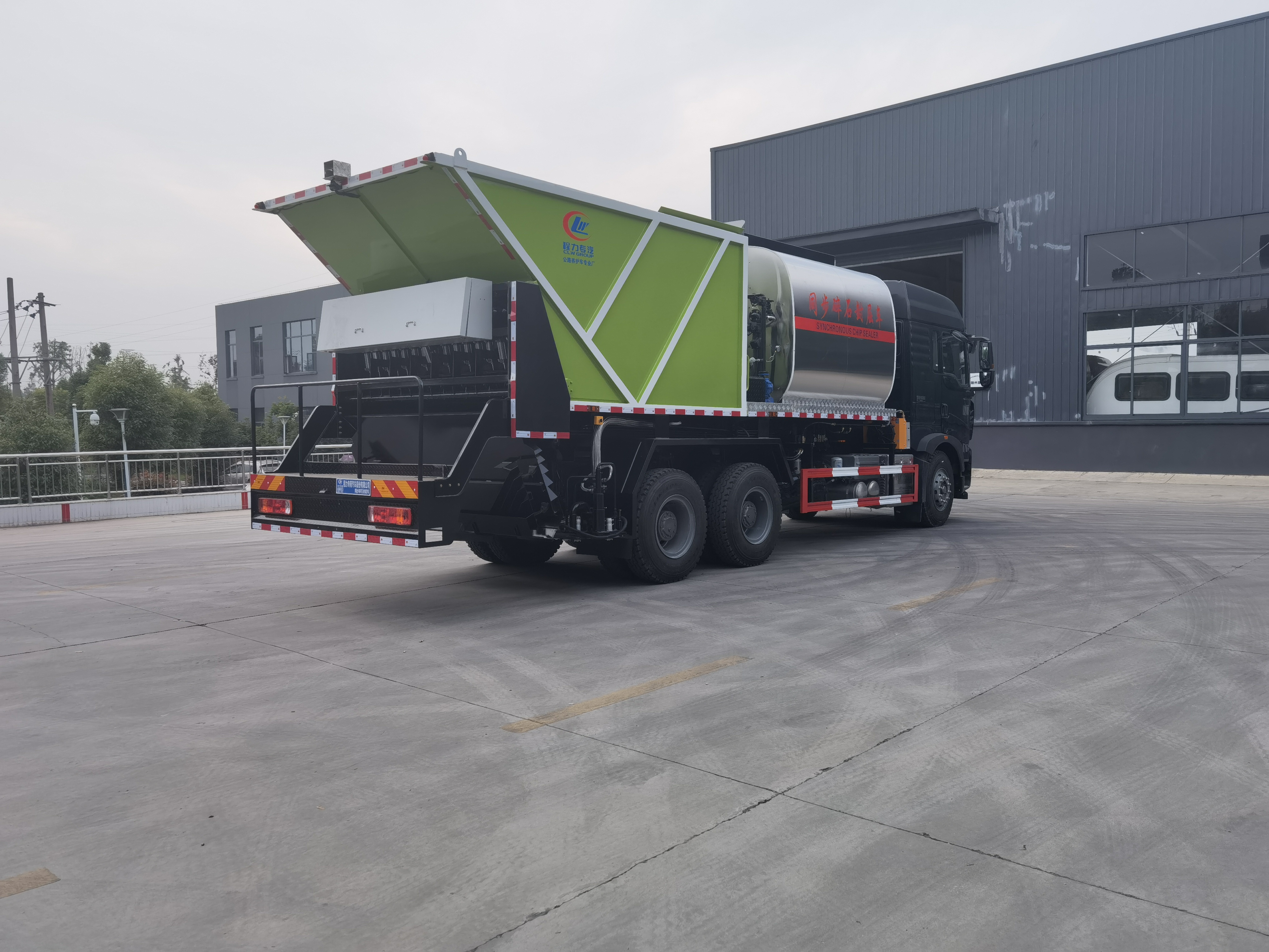 | 主要参数 | CLW5253TFCZ6型同步碎石是由我公司自行研制开发设计,具有自主知识产权的同步碎石封层车。达到了机、电、液合一化操作,设备操作工序得到简化,操作简单,整机技术性已达到世界先进水平。整机性能参数产品型号: CLW5253TFCZ6总 质 量:25000kg整备质量:17100kg外形尺寸:10240×2550×3710mm沥 青 罐:8m³石 料 仓:12m³撒布宽度:4000mm喷嘴间距:125mm沥青撒布量:0.2~1.5kg/m2石料规格 :S3~S24mm加热方式:利雅路柴油燃烧器+导热油自动升温喷洒介质:热沥青、SBS改性沥青、乳化沥青、改性乳沥青。撒布误差:±1.5%。 | ||