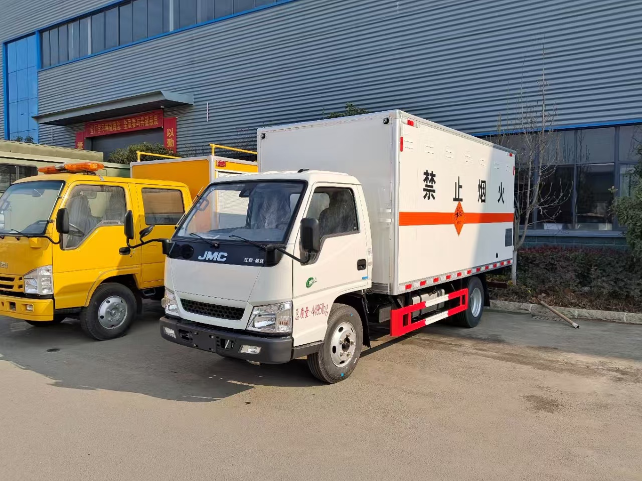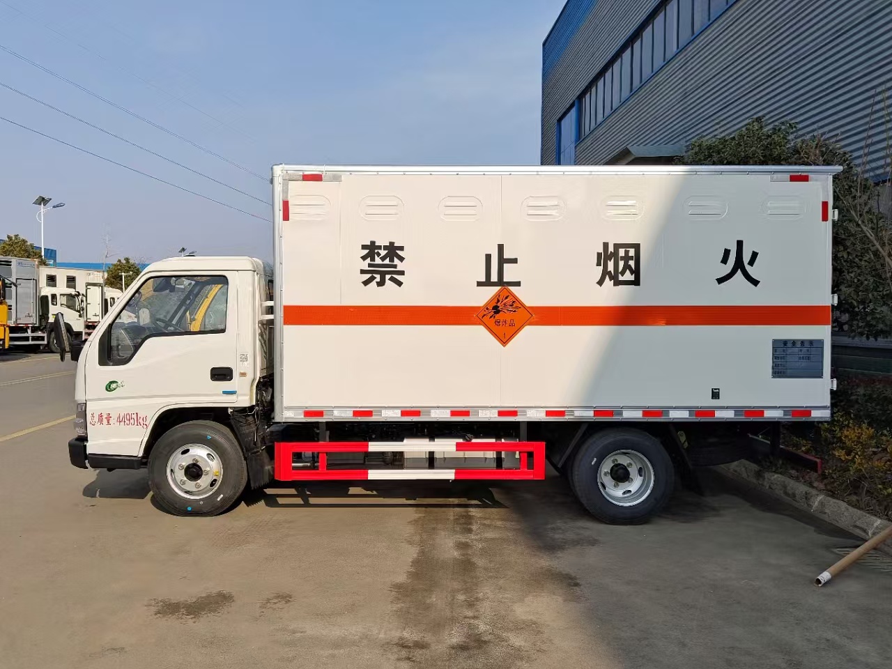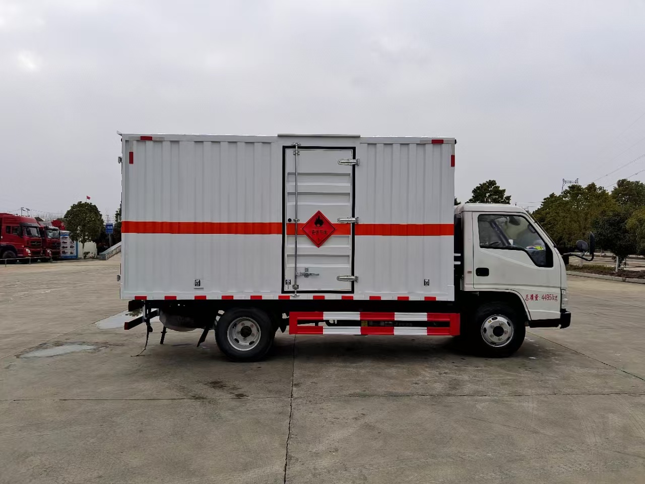 | 货箱配置 | 厢体为双层金属骨架结构,外板采用冷轧钢板,中间填充阻燃泡沫,内饰为铝板。底板为平板上铺防静电胶皮。厢内两侧加装固定货物卧环,门框带防盗报警器,顶部带烟雾报警器,厢体右侧选装侧门,随车配2个灭火器,危险标志牌,防火帽,危险品三角顶灯。 | ||