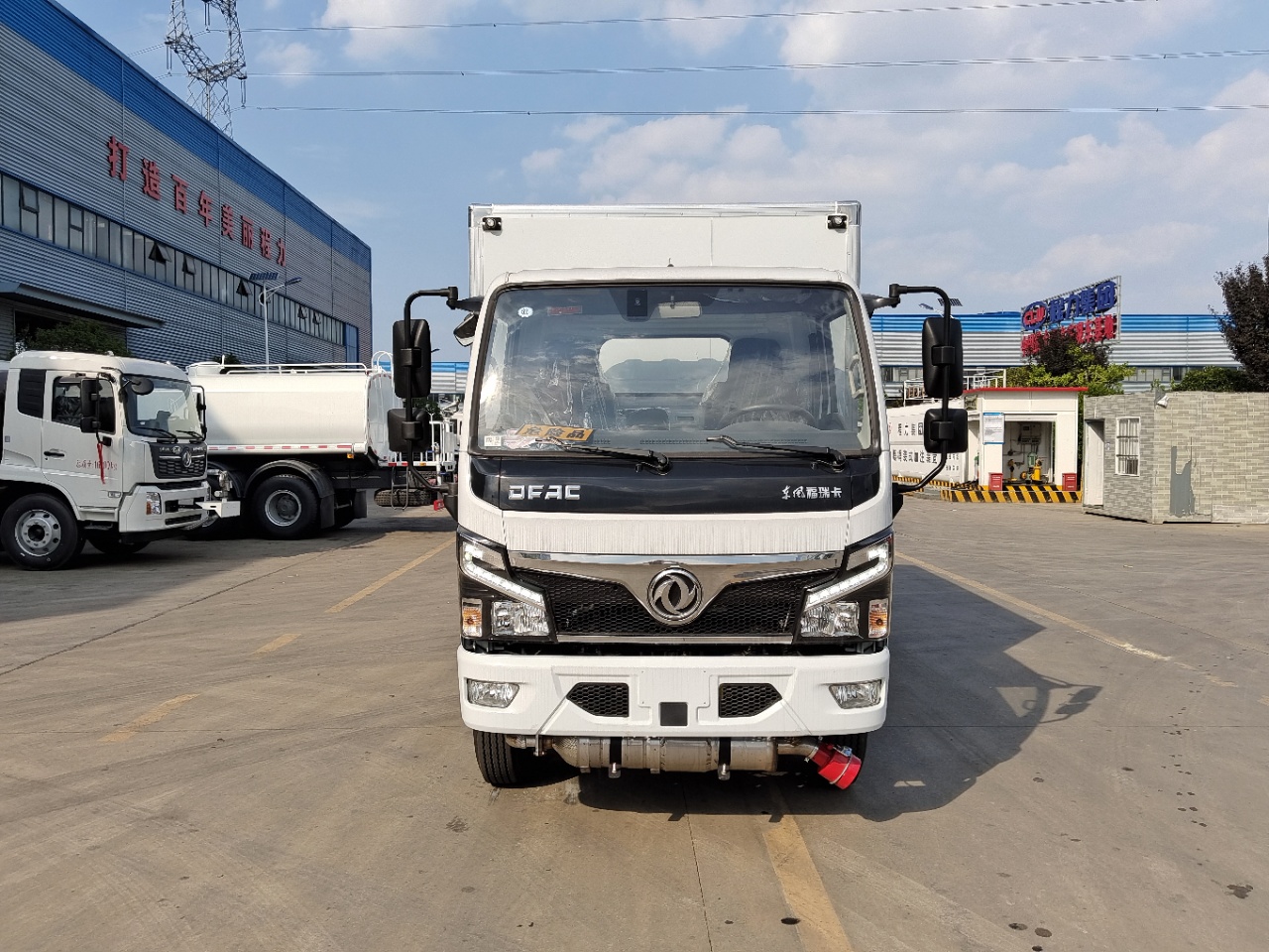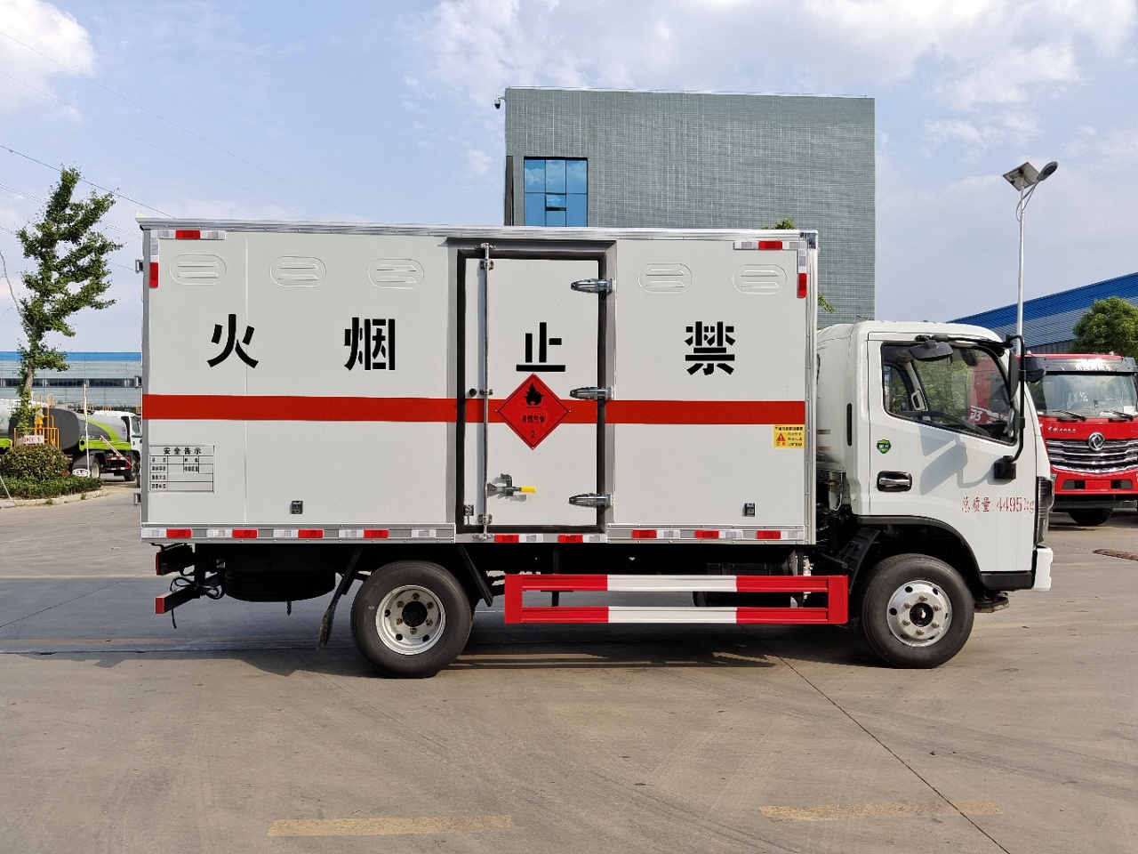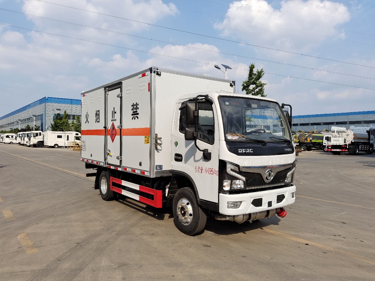 | 货箱配置 | 厢体为双层金属骨架结构,外板采用冷轧钢板,中间填充阻燃泡沫,内饰为铝板。底板为平板上铺防静电胶皮。厢内两侧加装固定货物卧环,门框带防盗报警器,顶部带烟雾报警器,厢体右侧选装侧门,随车配2个灭火器,危险标志牌,防火帽,危险品三角顶灯。(也可用瓦楞板) | ||