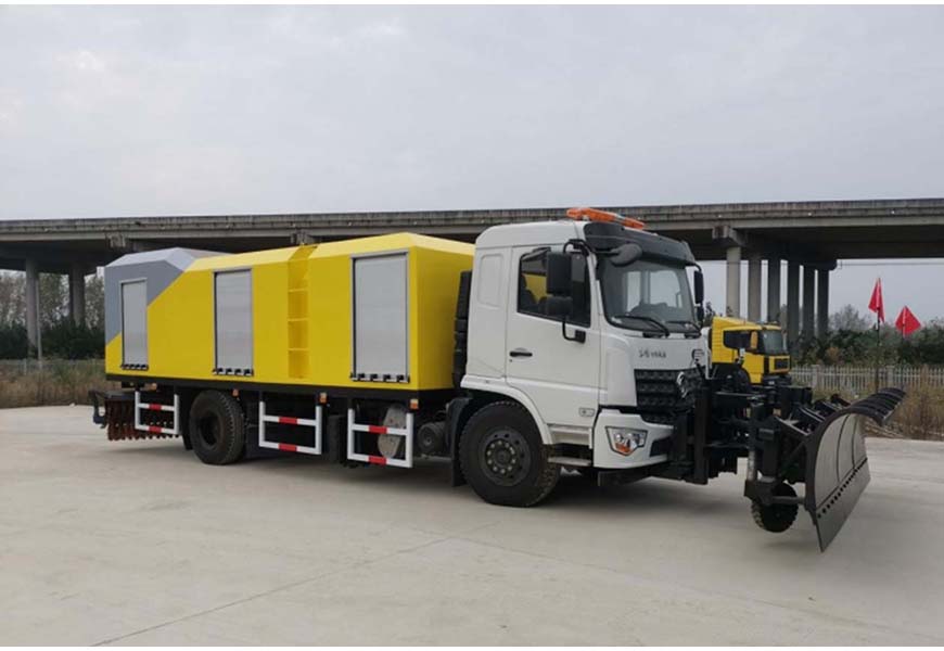 | 上装配置 | 前置推雪铲、中置破冰辊+除冰铲、后置扫雪滚刷,150Kw副发动机,封闭式厢体结构带中部爬梯,左右各 3 个铝合金卷帘门,尾部配备双大箭头 LED 指示灯+LED 显示屏,叁段式独立避障,每段都具有自动上弹、自动复位的避障功能,具有浮动和随路面仿形功能。除雪铲铲刃和破冰辊刀片高强度耐磨合金钢,硬度 50-55HR。后置除雪滚刷,用聚丙烯刷毛和强性钢丝混合制成。 | ||