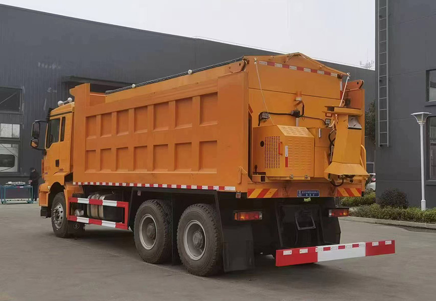 | 上装配置 | 箱体采用优质碳钢板,标配10立方撒布机也可以选装12立方,不锈钢撒布机甩盘,撒布盘直径550mm,撒布机采用 V 型料仓,结构简单可靠,使融雪剂自动落料,出料完全,无残留,箭头灯、篷布、过滤网、后爬梯。加装3.5米雪铲,可切换3.5米除雪滚刷(滚刷可选自带动力或者液压取力)。 | ||