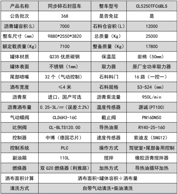 湖北程力汽车:程力CL5250TFC6BLS型陕汽德龙后八轮沥青同步碎石封层车产品型号及参数配置,程力CL5250TFC6BLS型陕汽德龙后八轮沥青同步碎石封层车高清图片,程力汽车系列程力CL5250TFC6BLS型陕汽德龙后八轮沥青同步碎石封层车最新报价请拨打客服热线。车辆主要配置 产品商标 程力牌 公告批次 372(扩展) 产品名称 同步碎石封层车 产品型号 CL5250TFC6BLS 总质量(Kg) 25000 罐体容积(m3) 额定载质量(Kg) 7070 外形尺寸(mm) 9900 × 2550 × 3820 整备质量(Kg)...