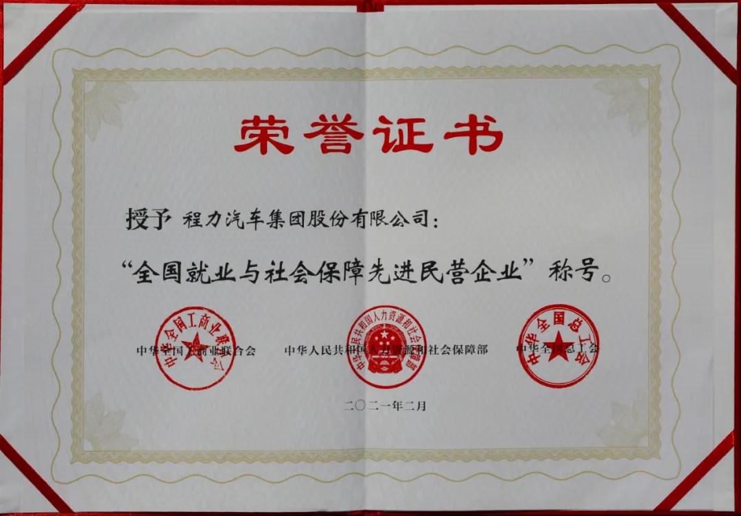 3月2日,程力汽车集团股份有限公司收到国家人力资源和社会保障部、中华全国工商业联合会、中华全国总工会联合颁发的“全国就业与社会保障先进民营企业”荣誉证书及牌匾,这是程力汽车集团股份有限公司在2021年初被授予的开门红全国性殊荣,也是程力集团继2020年连续三次受到全国性荣誉表彰。