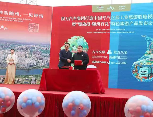 在程力工业旅游产品发布会上,程力汽车集团总经理程阿罗(左)与鄂旅投总经理王涛,签署了文化旅游战略合作框架协议,双方决定利用各自的优势强强联合,共同开发工业旅游潜在市场,为随州的经济发展增添新的动能。