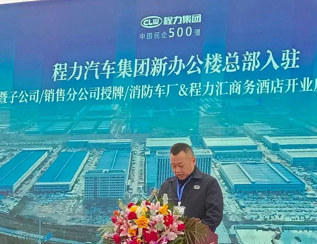 在程力集团新厂办公大楼总部入驻庆典会上,集团总经理程阿罗为程力消防车公司总经理汪东洋,举行了消防器材厂开业授牌仪式,汪东洋总经理作了表态和发言。